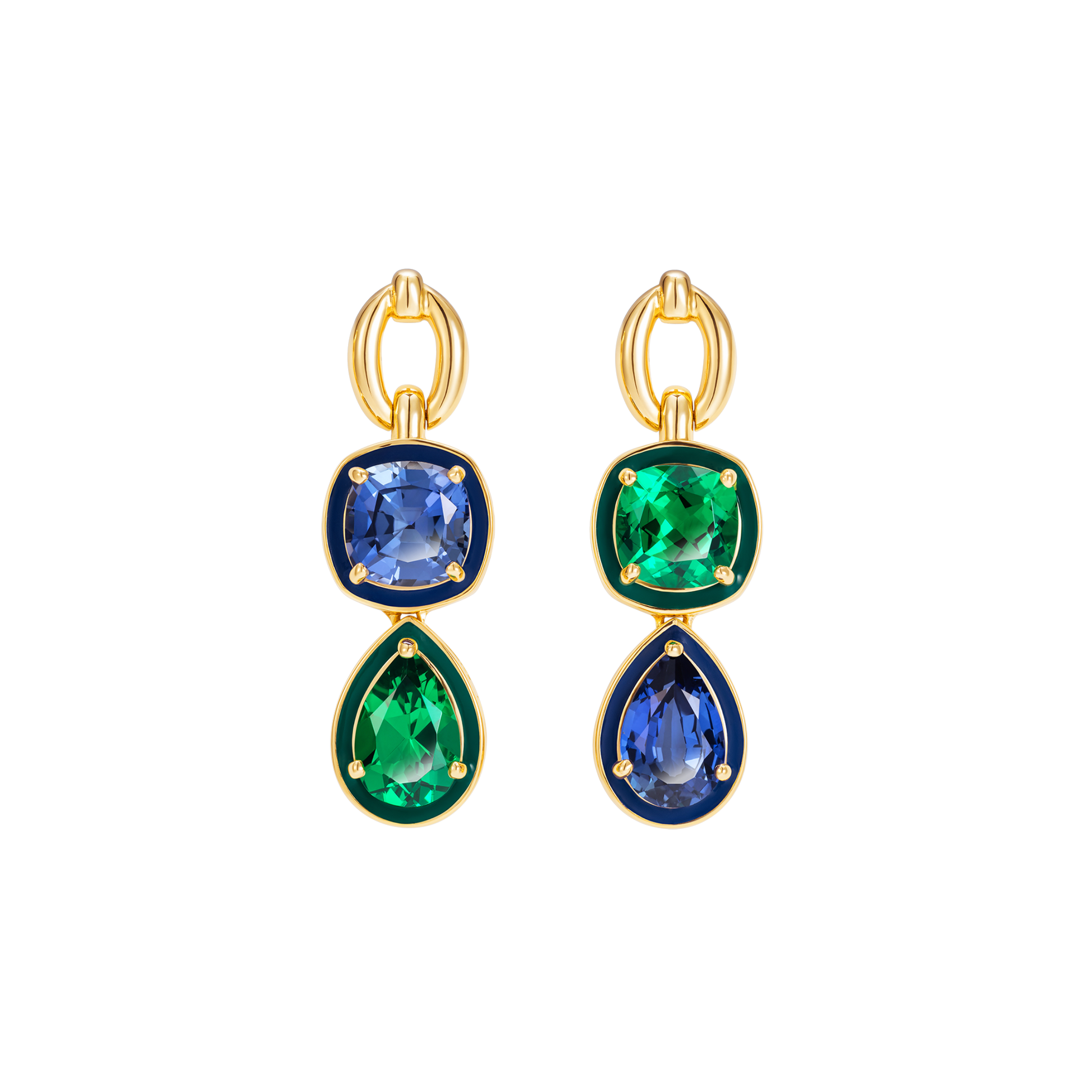 Catena Double Stone and Enamel Earrings in 18k yellow gold (8.78g) with blue and green enamel, blue sapphire and emerald.