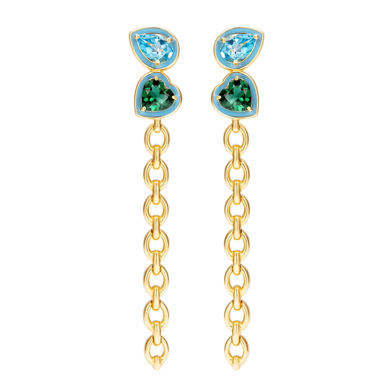 Catena Double Stone Long Enamel Earrings in 18k yellow gold (13.09g) with turquoise enamel, blue topaz and emerald.