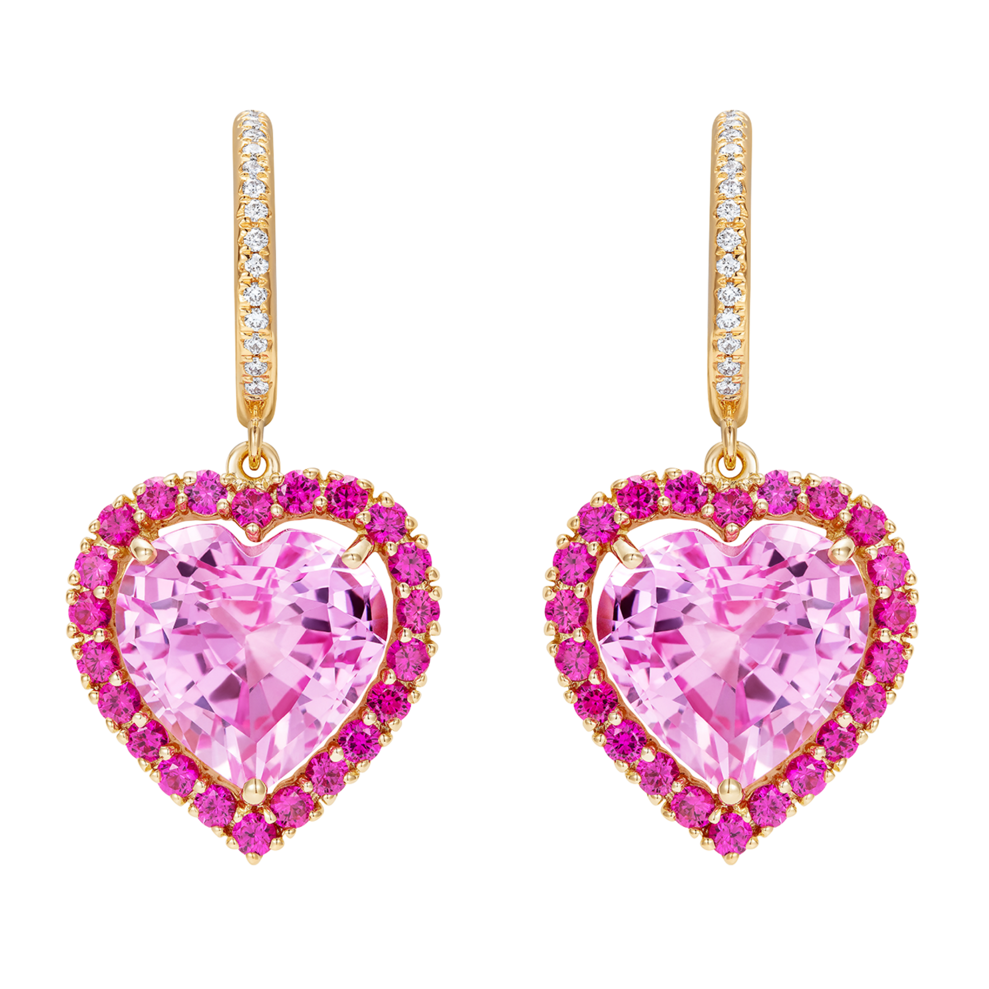 Le Cercle Heart Shaped Pink Sapphire & Diamond Earrings in 18k yellow gold 12.04g with a heart shaped central pink sapphire and pave set pink sapphires (total weight of pink sapphires 17.16ct), and diamonds (0.16ct).