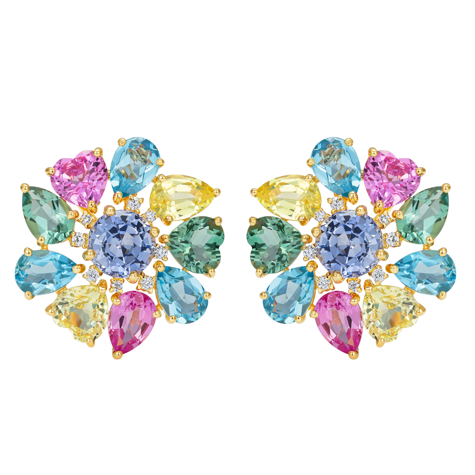 Catena Spring Flower and Leaf Large Stud Earrings in 18k yellow gold with the flower is set with orange sapphires, pink sapphires, green amethysts, yellow sapphires, blue topaz and diamonds.