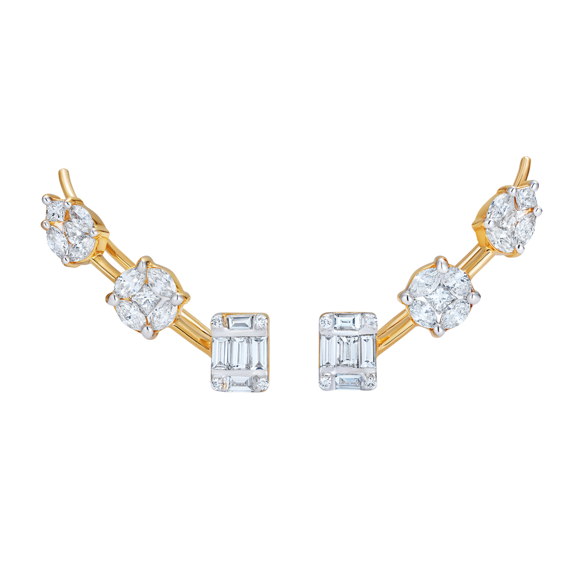 Le Cercle Floating Illusion Diamond Short Ear Climbers in 18k yellow gold (5g) with multi shaped princess, baguette, marquise, pear and brilliant cut diamonds (total weight 1.40ct).